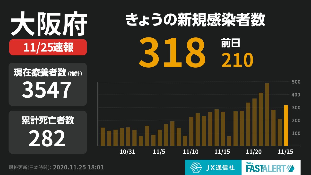 大阪府、新たに318人新型コロナウイルスに感染確認(2020年11月25日)