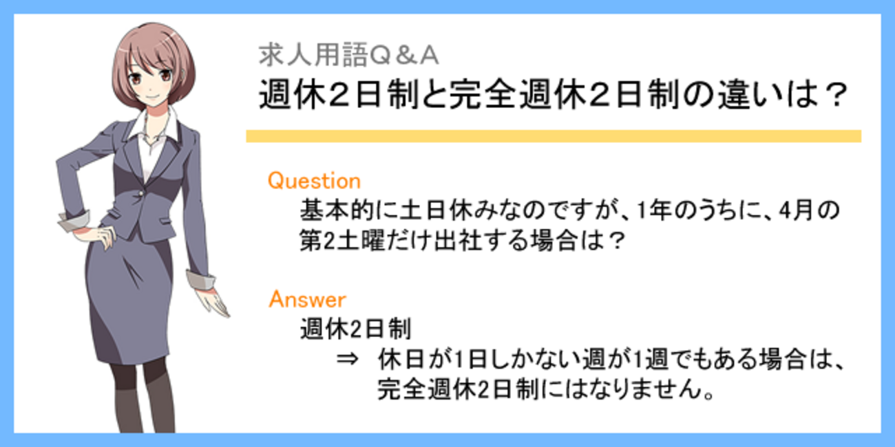 ※毎週の土曜と日曜、祝日が必ず休める場合は、「完全週休二日制(土・日)、祝日」と表記されます。