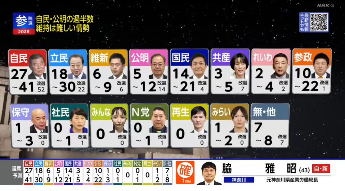 【速報中】参議院選挙 2025 自民党・公明党 過半数維持は難しい情勢 国民民主党・参政党は大幅に増加確実 | NHK | 参議院選挙
