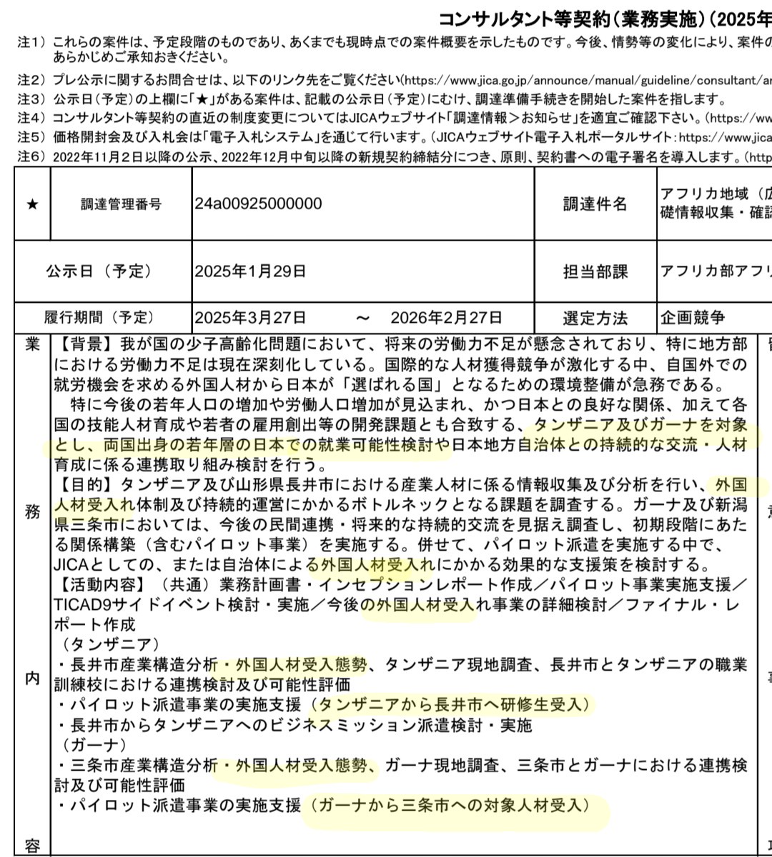 JICAの公示案件を見ると、ガーナから新潟県三条市への移住や就労のためのコンサル調査案件が既に半年前から動いてる
