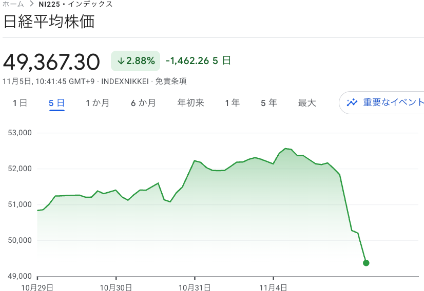 5日の東京株式市場で日経平均株価が急落し、下げ幅は一時1300円を超えた。前日の米株市場でハイテク株が調整した流れを引き継いだ。前週に史上初めて5万2000円台を付けるなど急騰していた反動が出た。
