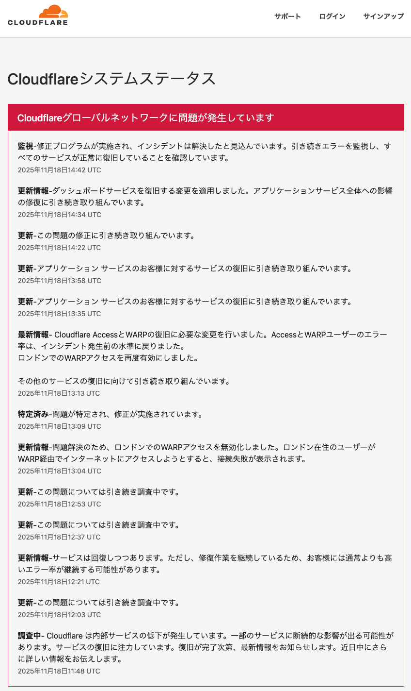Cloudflareは、複数のお客様に影響を与える問題を認識しており、調査中です。広範囲にわたる500エラーが発生し、CloudflareダッシュボードとAPIも機能しなくなりました。現在、