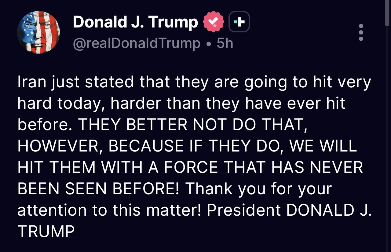 「イランはきょう、これまで以上に強力な攻撃を行うと表明した」とした上で「しかし彼らはそうすべきでない。なぜなら、もしそんなことをしたら、われわれはこれまでにない力で彼らを攻撃するからだ!」と述べた。