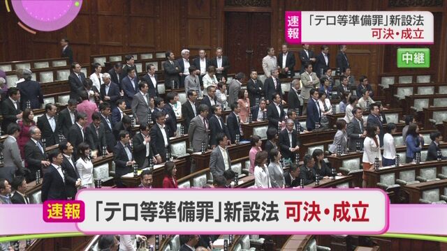 「共謀罪」の構成要件を改めて「テロ等準備罪」を新設する改正組織犯罪処罰法は、15日朝、参議院本会議で採決が行われ、自民・公明両党と日本維新の会などの賛成多数で可決・成立しました。
